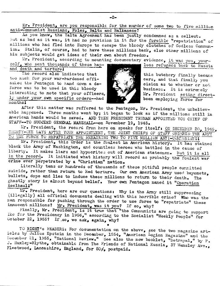 (for the FULL story of what the murderous Eisenhower did to the innocent German civilians AFTER the war was over, order from here THE SECRET HOLOCAUST by Eustace Mullins for only $9.00, S&H included. You will be enlightened with the suppressed facts you were never allowed to know.)